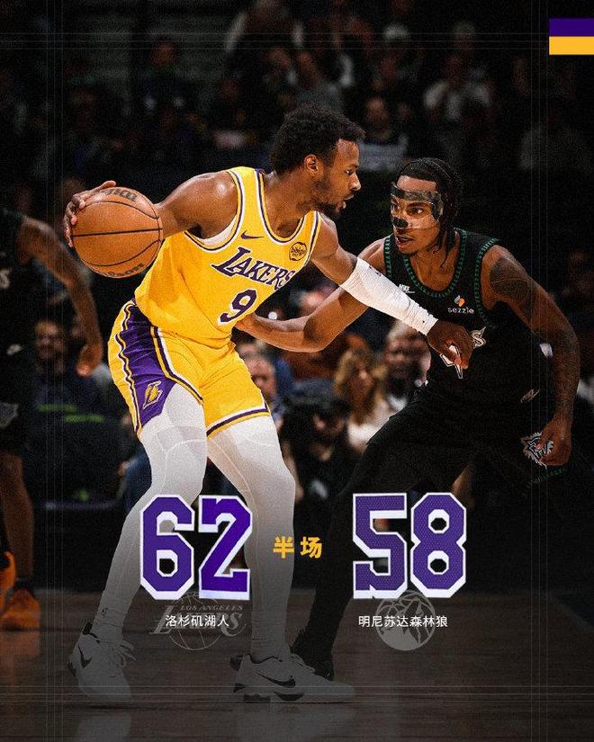 次节比赛,湖人连续两节单节轰下30+得分,森林狼则是进攻火力下滑比首节少得到10分。次节开局森林狼扩大7分优势,里夫斯连投带罚持续得分,艾顿也是接连内线吃饼,湖人逐步追到51-51。双方之后也是继续缠斗,湖人单节30-24净胜6分,上半场结束湖人62-58反超森林狼。前两节比赛,湖人三分13中4,全队3人得分上双,里夫斯18分9助攻、艾顿12+7与克内克特11分,森林狼三分17中8,兰德尔22分与麦克丹尼尔斯12分。